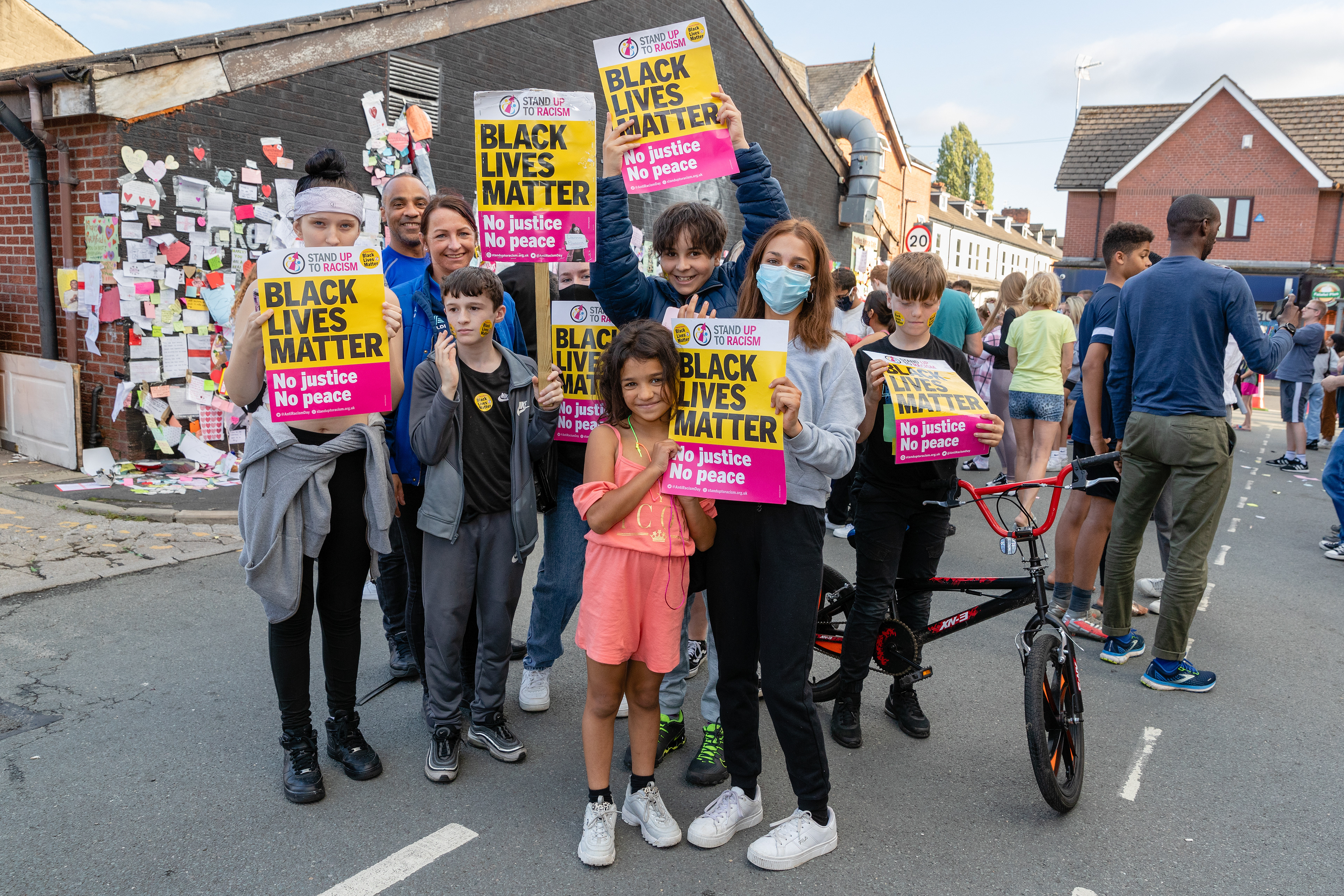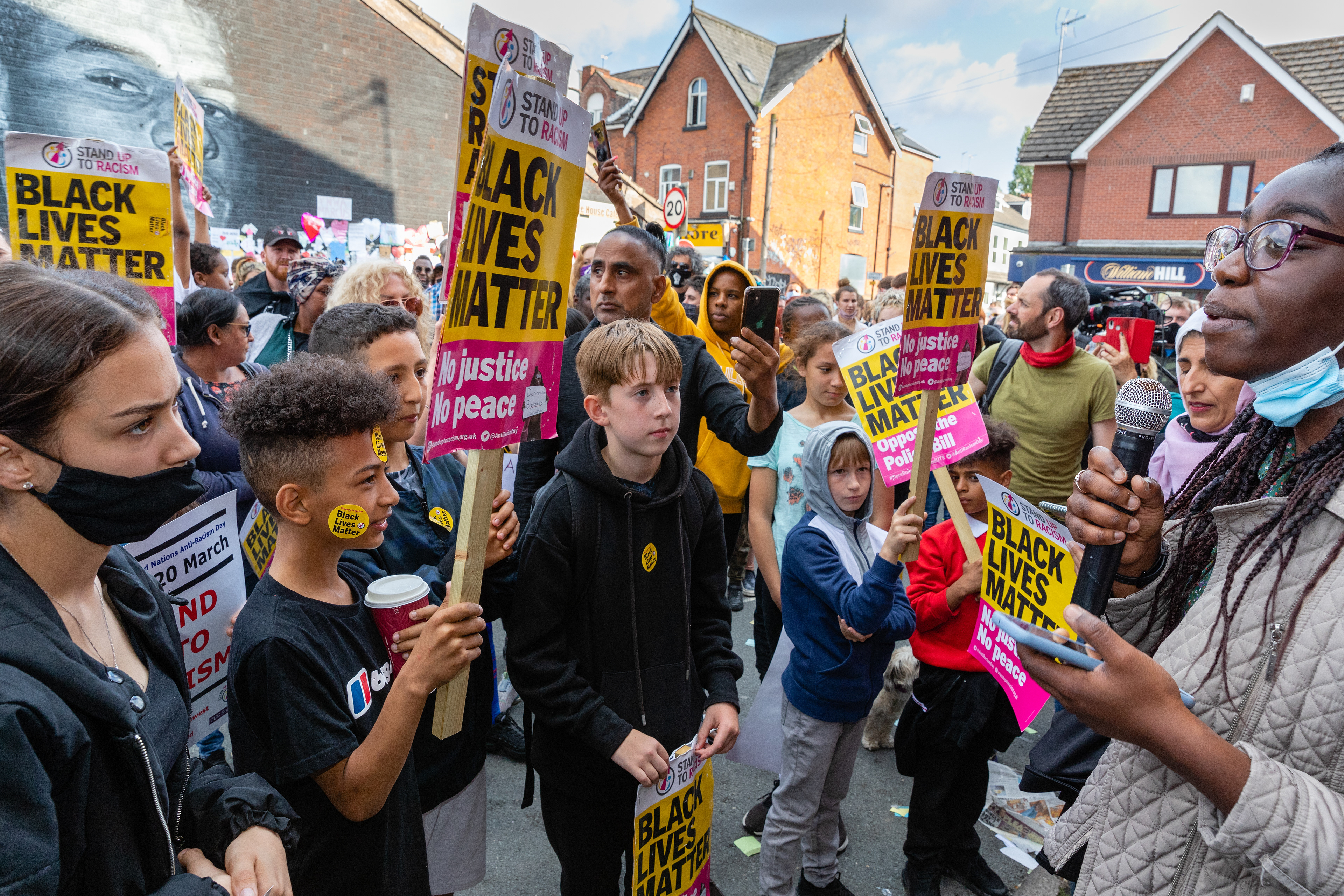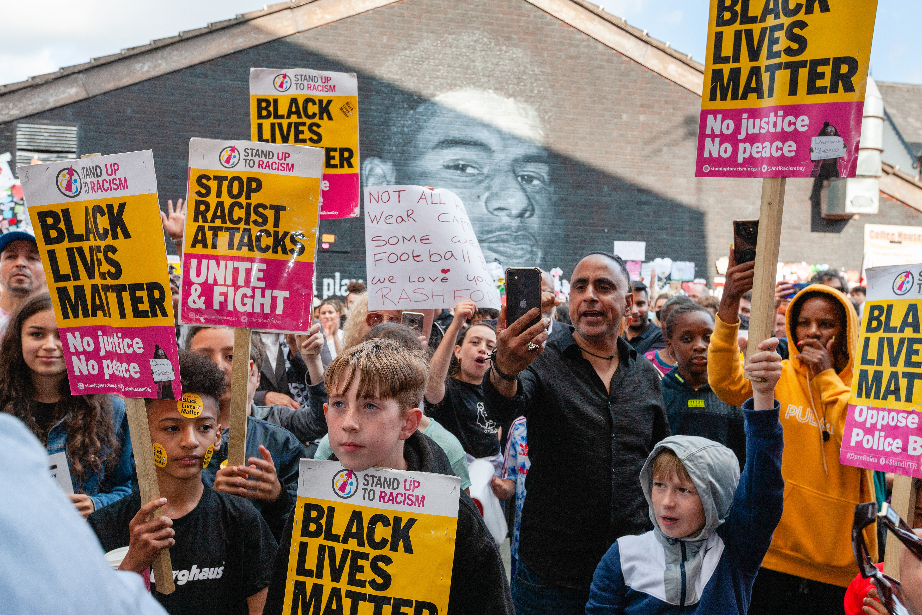 The Crowd Take the Knee at a Stand Up to Racism Demonstration by the Marcus Rashford Mural in Withington on 13 July 2021. Manchester, England. 2021.