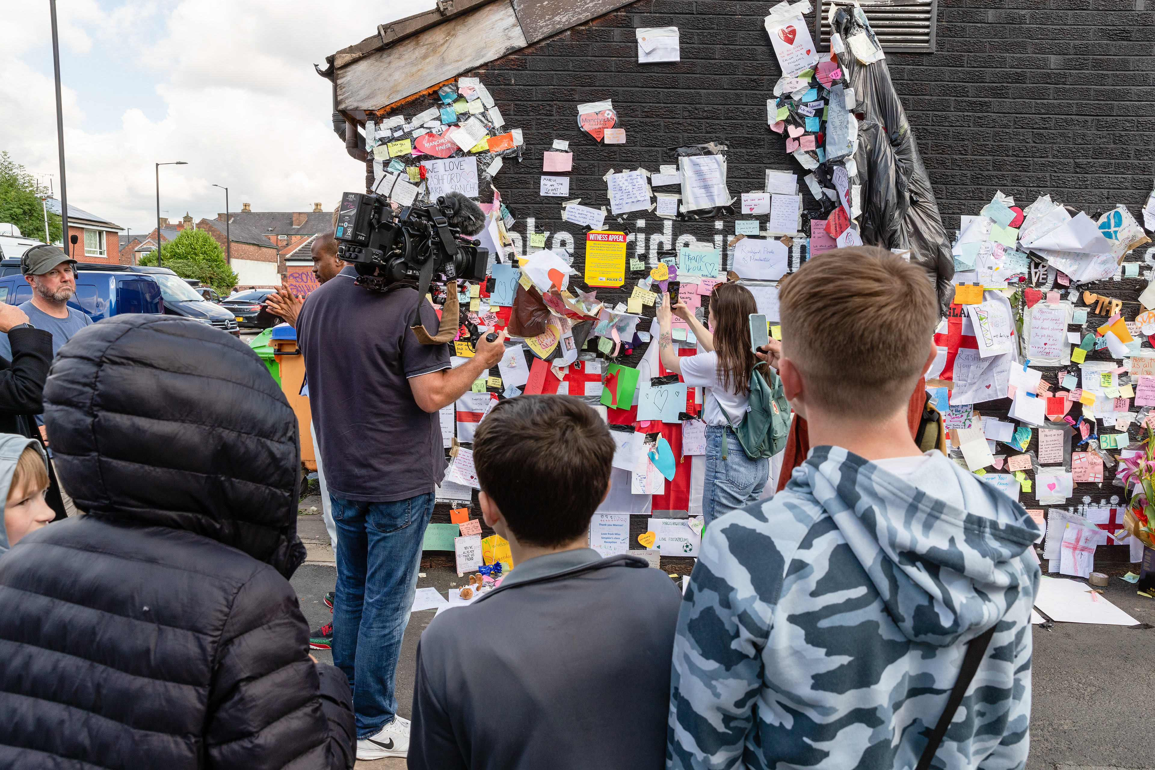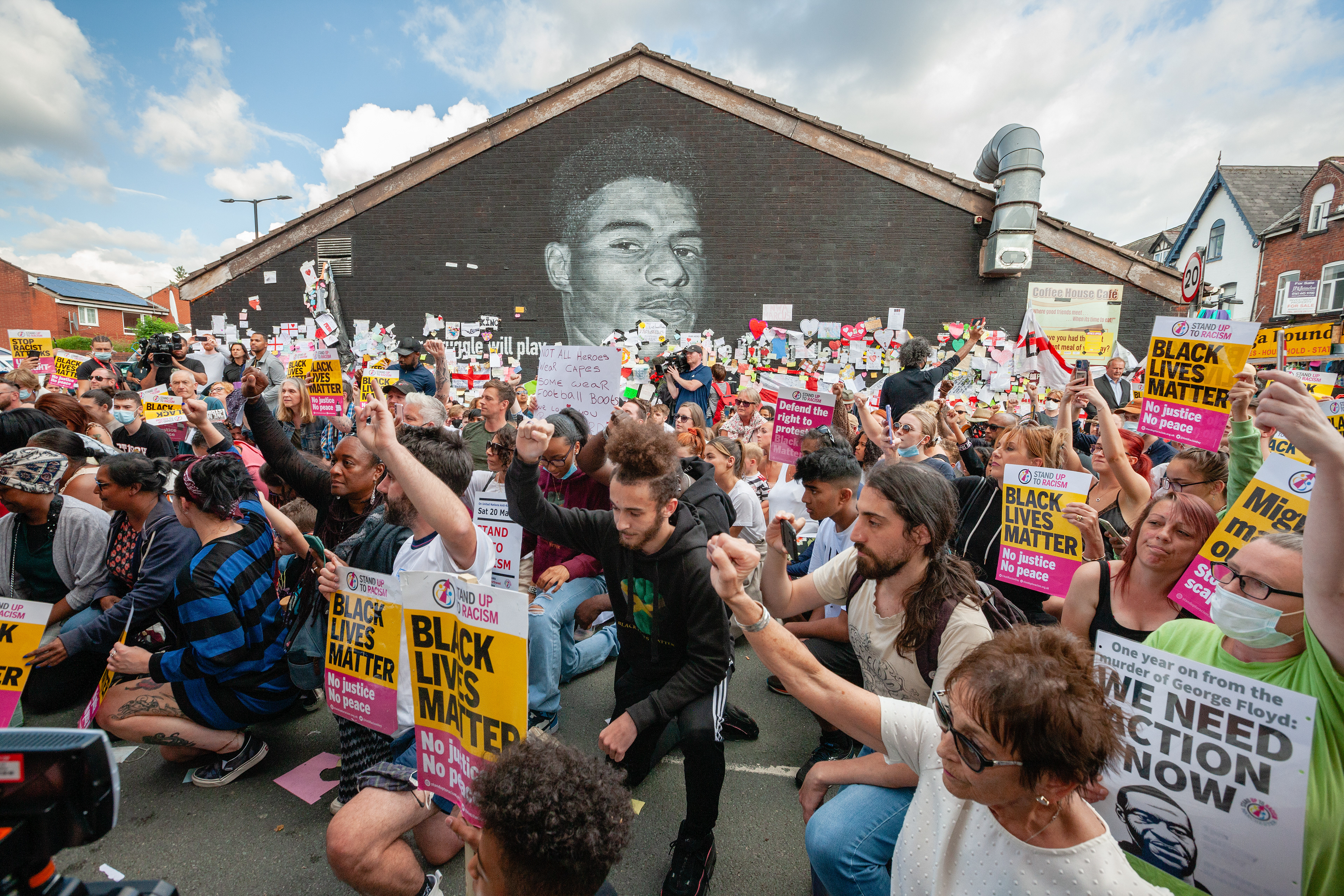 Residents Gather by the Marcus Rashford Mural in Withington on 13 July 2021. Manchester, England. 2021.