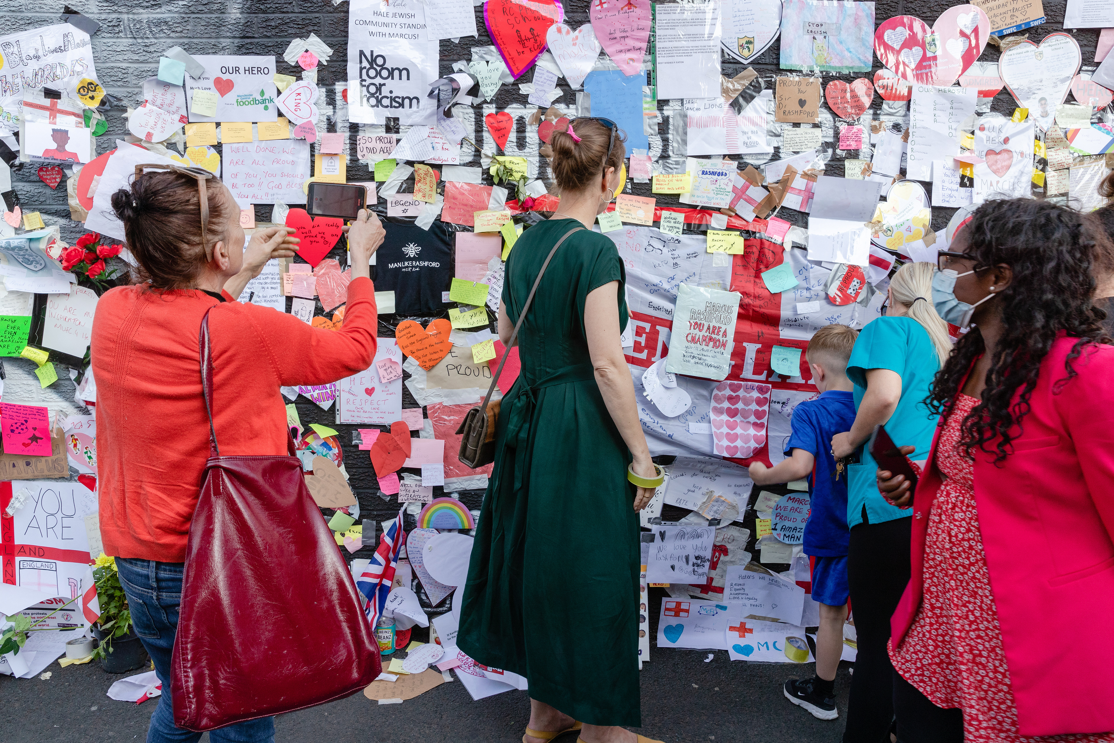 People Observe a Greater Manchester Police Witness Appeal Sign by the Marcus Rashford Mural in Withington on 13 July 2021. Manchester, England. 2021.