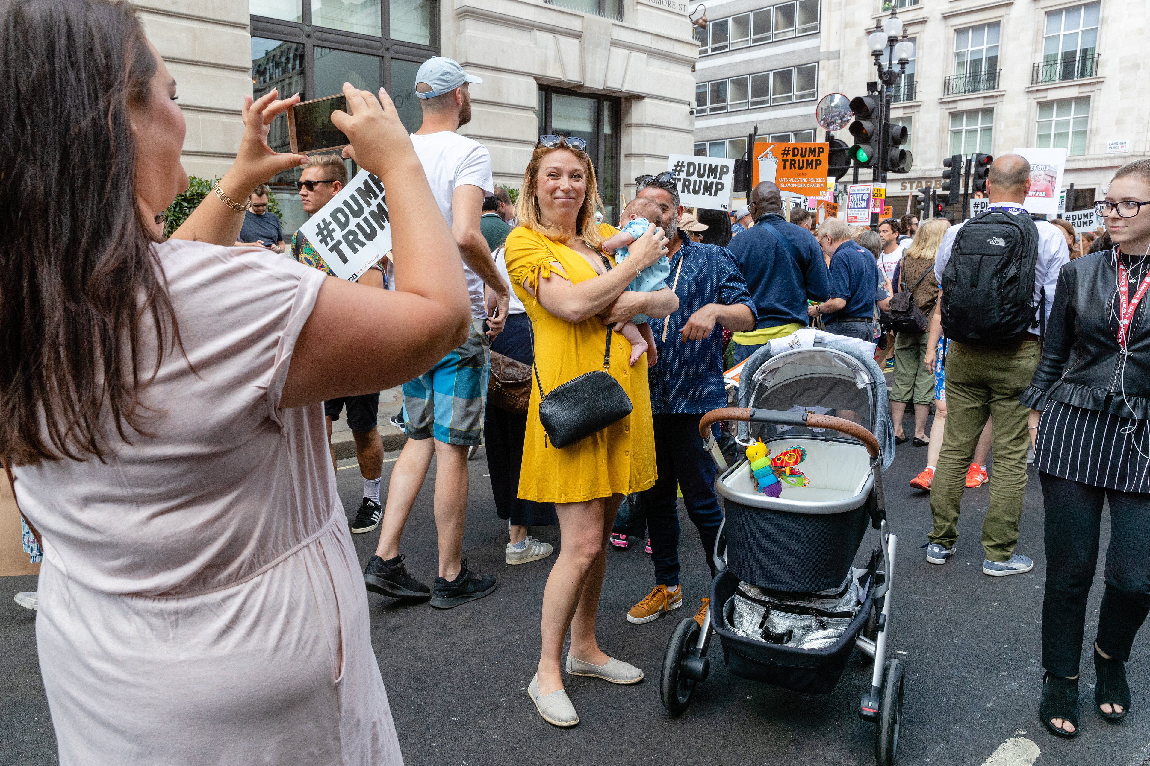 First Protest; Protestors at the National Demonstration 'Together Against Trump' on 13 July 2018. Langham Place, Westminster, London. 2018.